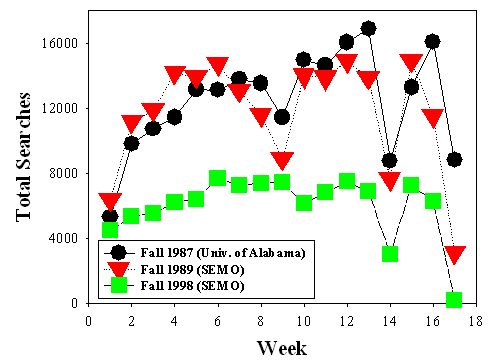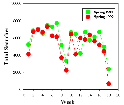 Figure 2 points up two additional points. One is that the line for fall 1998 looks much flatter than the other two lines. The reason is that it represents less intense searching. If the y-axis scale is expanded, i.e., the total axis range is made between 0 and 8000, this line will also look “m-shaped.”