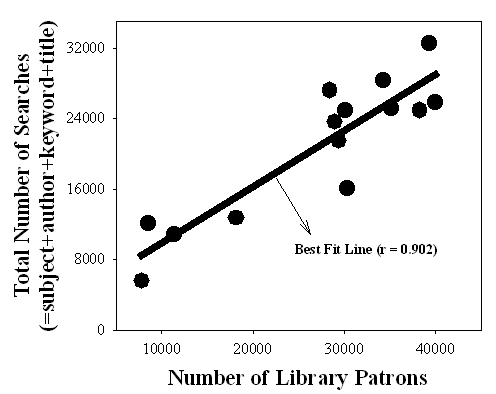 The second point is the drastic decline of almost thirty-five percent in OPAC searching at SEMO from fall 1989 to fall 1998. Figure 3 depicts how the building traffic affected the OPAC searching at SEMO for three semesters. Clearly, there is a linear dependence between these two variables. In fact, the linear correlation coefficient, r, is 0.902, suggesting strong dependence. R = 1 is a perfect correlation. This means that if more patrons come to the library more OPAC searches occur, an expected phenomenon. Since building traffic has dropped from 216,025 in the 1988 fall semester to approximately 141,670 in the fall 1998 (35% drop), it is, therefore, not surprising that the number of searches has also dropped dramatically. The declines in searching and in building traffic have many implications for library administrators, some of whom see Internet technology as taking up the slack for the decrease in use of library services. However, the exact reasons for this drop are yet to be ascertained. Perhaps a more clear picture will emerge by comparing current search numbers with those generated after Kent Library's OPAC becomes web based. If, however, fewer numbers of searches remain the norm and if a strong correlation continues between OPAC searching and building traffic, it will be our job at SEMO to find ways to bring students and faculty back into Kent Library so that our facilities and services will be optimally used.