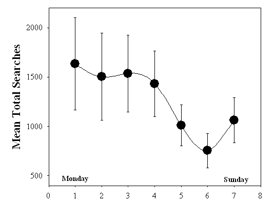 The data presented here not only confirm the presence of the “m-shape” behavior but also afford further support that indeed more manpower is required on Mondays through Thursdays. Figure 4 provides supportive evidence for this trend. The I bars in this figure represent the standard deviations, which clearly show that it is not possible to predict which day of a particular week will always be the busiest. However, since Mondays through Thursdays have consistently been the highest OPAC usage days for ten years, it is clear that the greatest number of reference staff are consistently needed Mondays through Thursdays. This is the case even with the negative downward pressure on the total number of OPAC searches.