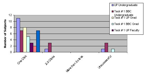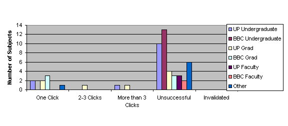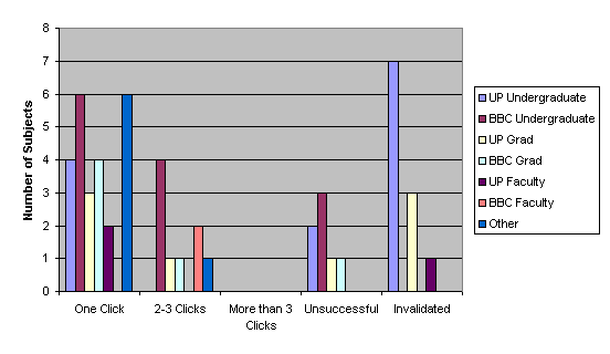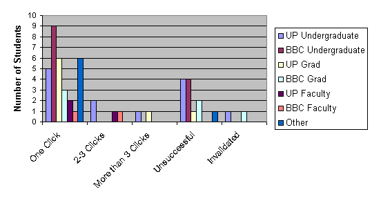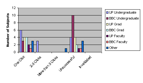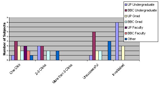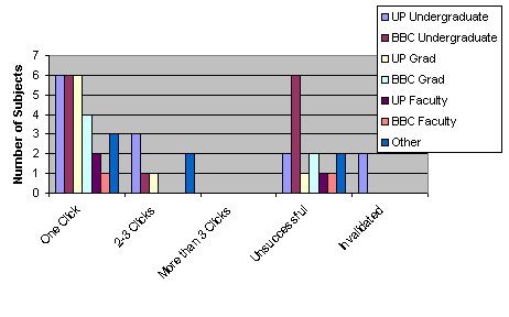 The subjects recruited should be representative of “real” users (National Cancer Institute, 2001). The original goal of the FIU study was to recruit 30 respondents from three main target groups: undergraduates, graduate students, and faculty. Librarians chose subjects informally, by approaching patrons within the library. As a result of our recruiting method, we fell short of our goal. We tested 52 subjects: 26 undergraduates, 13 from each of the two campuses; 14 graduate students, 8 from UP and 6 from BB; 5 faculty members, 3 from UP and 2 from BB; and 7 who fell into the “other” category.