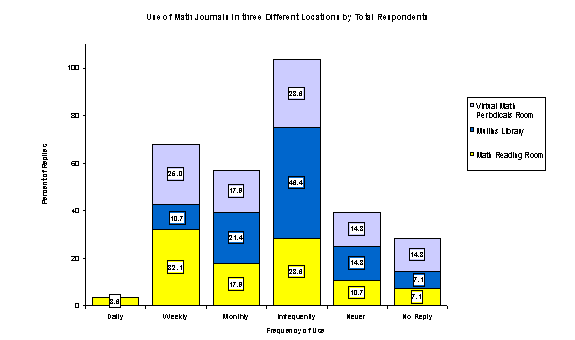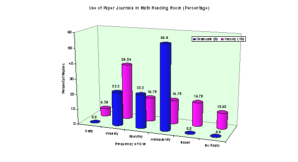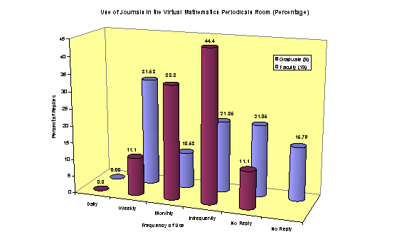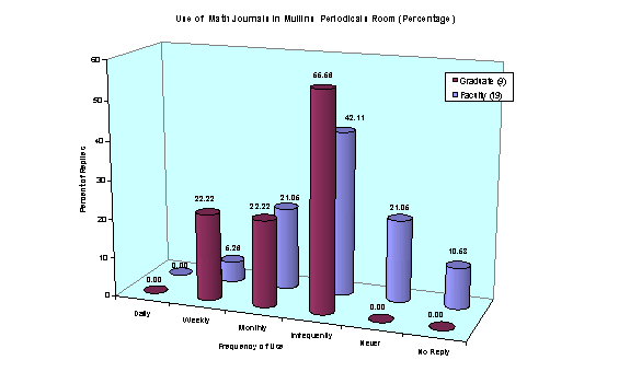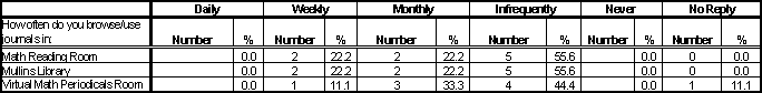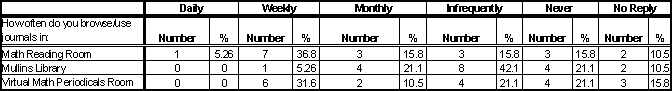 The results obtained from this survey clearly demonstrate that the majority of the faculty use the Mathematics Reading Room and the Virtual Periodicals Room on a weekly basis. Only one faculty member uses Mullins weekly. Twelve (63%) of the faculty never or infrequently uses Mullins Library Periodicals room for browsing current periodicals.