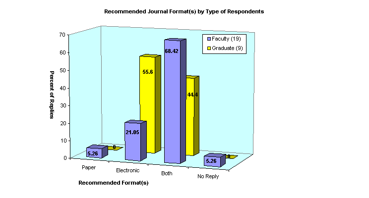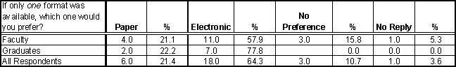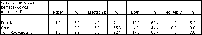 Most of the faculty (68.4%) recommended that the library continue to subscribe to both print and electronic formats, while 21.1% recommend electronic access only. Only one faculty recommended subscription to paper format only. However, if only one format was available, the majority of the faculty (57.9%) and the graduate students (77.8%) identified electronic access as the preferred option. Four (21.1%) of the faculty identified paper as the preferred option and 3 (15.8%) of them had no preference. Overall, 18 respondents (64.3%) recommend electronic access, 6 (21.4%) recommend paper, and 3 (10.7%) had no preference.