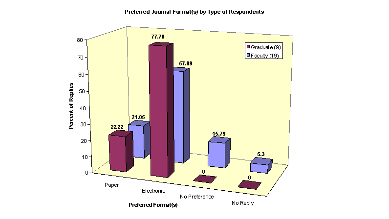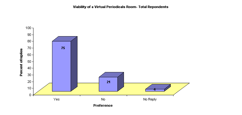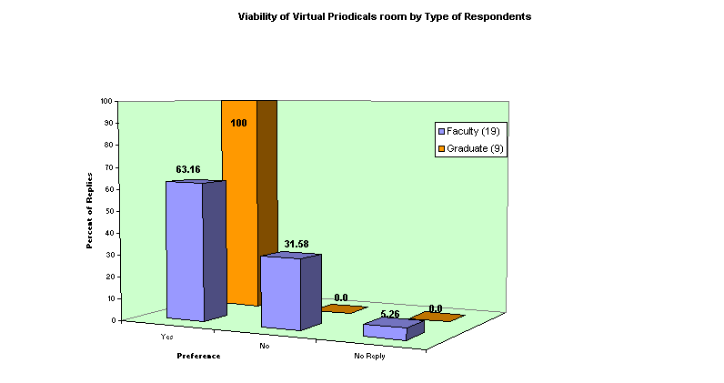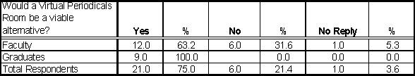 On the question of whether a Virtual Periodicals Room would be a viable alternative to paper format, the majority of the faculty (12, 63.2%) and all the graduate students (9, 100%) agreed, while six (31.6%) of the faculty do not think it is a viable option. Overall, 21 (75%) of the respondents agreed and 6 (21.4%) disagreed.