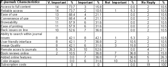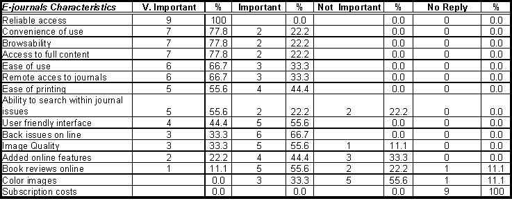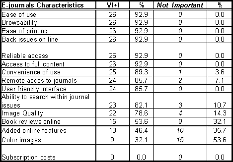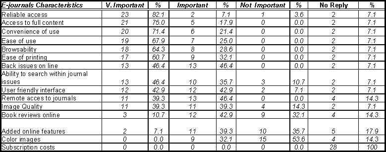 E-journal characteristics that are desirable for all respondents in order of importance are: reliable access; access to full content, convenience of use (remote access); ease of use, browsability, ease of printing, back issues of journals online, ability to search within journal issues, user- friendly interface, book reviews online, and image quality. Color images and subscription costs are not important to them.