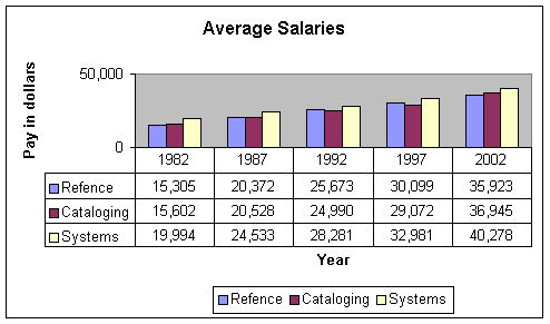 When computing average salaries, systems librarians consistently averaged higher salaries than either reference or cataloging librarians. Systems librarians have also seen the biggest increase in average salaries. Reference librarians made less than technical services librarians except in 1997 when they averaged slightly higher [Figure B]. Overall, systems positions were paid an average of 7% higher than either reference or technical services.