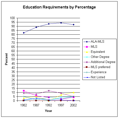 Analysis of the data shows the first two hypotheses hold true as valid. Over time employers required more knowledge and experience gained outside the classroom such as supervision/leadership skills, diversity awareness, and interpersonal skills, while decreasing the emphasis on coursework. Various types of required job-related experience, most notably computer/automation, technical services, and bibliographic instruction experience, show a strongly increasing trend among requirements by potential employers.
