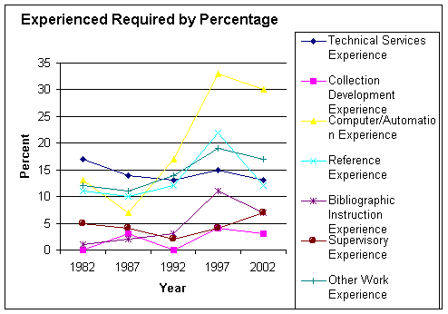 Reference placed little emphasis on technical services experience, with an average of 2% of positions requiring it. Collection development experience peaked in 1997 with 7% of positions requiring it. Computer/automation experience rose yearly until 1997 with 31% of positions listing it. Reference experience remained around 17% except for 1997 when 31% of positions required it. Bibliographic instruction experience saw a huge rise from 3% in 1982 to 17% in 1997 and 10% in 2002. Supervisory experience has always been low with an average of 3% of the positions listing it as a requirement. Finally, other work experience on average has been required in 17% of the jobs, reaching a peak in 1997 with 22% of the jobs. Overall data analysis shows the differences as statistically significant [Figure I].