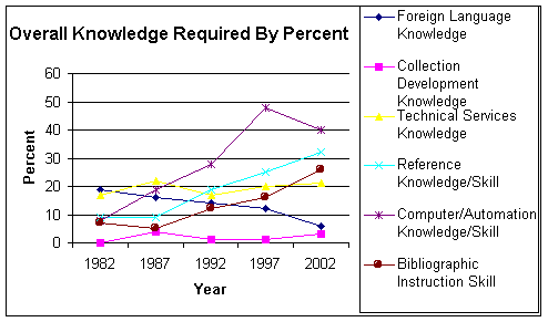 An interesting trend in technical services librarianship was a decrease in the demand for knowledge of a foreign language; this could be due to the lack of qualified candidates and the availability of bibliographic utilities such as OCLC to catalog foreign language materials. Another interesting trend in systems librarianship was a significant decrease in the level of technical services knowledge required. This may be representative of systems librarianship moving away from its technical services roots as varying library technologies away from technical services became increasingly important. Data from recent years; however, shows a comeback in technical services knowledge for systems librarians. This is likely indicative of the continued importance of the automated catalog as a core library technology. Collection development knowledge has remained low for all areas, indicating it is not an entry-level skill. All three areas showed an increasingly strong demand for knowledge in their respective fields, possibly indicating a decrease in on-the-job training. Reference librarianship indicated a strong increase in the demand for knowledge of bibliographic instruction, again indicating that bibliographic instruction has become a large part of a reference librarian's duties. Computer/automation knowledge rose dramatically and peaked in the 1997 data. By 1997 computer knowledge was becoming much more commonplace across all professions so it became less necessary to advertise specifically for it.