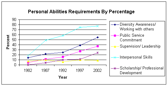 The findings concluded there was an increased demand for diversity awareness and working well with others with 51% of positions requiring it by 2002. Public service commitment has found increasing support, especially among reference positions. Supervision/leadership skills were at their highest in 1997, with technical services positions most likely to require them. Interpersonal skills became very important. By 2002 nearly two-thirds of the positions required them. Additionally, there has been an increase in demand to participate in professional activities, while no position listed it as a requirement in 1982 [Figure R].