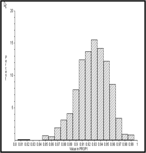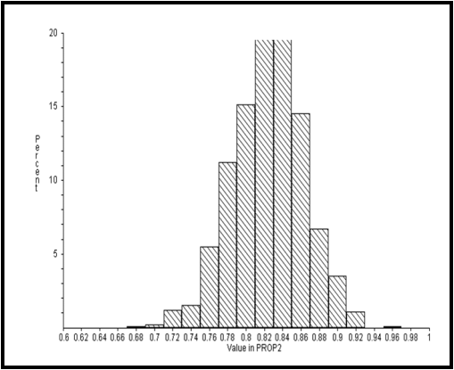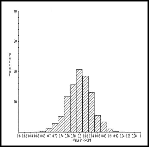 Figure 2 shows the distribution of proportions of matches for the pair of designated terms. A success is defined when the both designated terms are matched by terms in the document. Approximately 80% of the documents in the 100 document sets contained the pair of designated terms. Matching ranged from 66% to 94%. The sampling distribution is symmetrical and approximates the Gaussian form. These results are consistent with the product of the individual probabilities (i.e., 0.83 x 0.88 = 0.79).