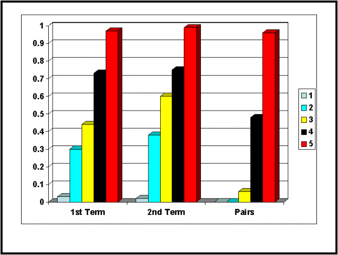 Figure 3 shows the distribution of proportions of paired matches ranging from 81% to 98% with central value approximating 93%. The distribution for the matching of the first designated term ranged from 85% to 98% and the distribution for the second designated term ranged from 94% to 100%.