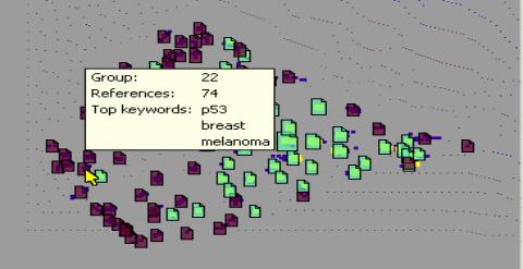 This approach seeks to build a new type of text warehouse containing themes defined using statistical criteria, document grouping identification, and copies of the original documents. With this resource, the terms important in identifying the cluster of documents are known in advance and they can be retrieved based on that prior knowledge. Figure 1 showed an example of this output. The full set of documents entered into the text warehouse are grouped according to combinations of informative terms and displayed graphically. By highlighting a particular cluster, the terms involved in defining the cluster are shown together with access to the documents satisfying the statistical criteria. As seen, Group 22 contains 74 references and these are characterized by the triad consisting of p53, breast, and melanoma. The documents described epidemiologic research.