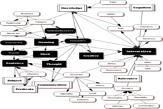 Author Semantic Indexing: Author Semantic Indexing is based on analysis of the concepts and relationships described in the philosophy of information.[Fallis 2004, Floridi 1999, Furner 2004, Goldman 2001, Hernon 1995] Figure 2 summarizes the perceptions regarding information. Links shown are those involving pairs of the terms as provided by the authors in their sentences. Of the 40 terms suggested as representing information and related concepts, 10 have particular interest (shown with black background and white text) in terms of justifying a computerized process.