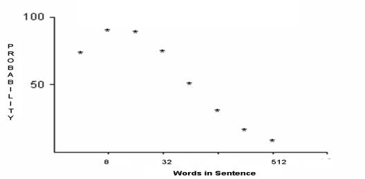 Figure 3 showed the relative frequency of all duplicates in sentences containing 4 to 512 terms. As seen, the occurrence of pairs was more than 90% when the length of the text string analyzed consisted of 8 to 20 words. The typical abstract of 250 words has a probability of recognizing random words in couplet patterns approximated 20% of the time. Triads in random word sentences occurred approximately 70 percent of the time when the sentences contained 8-10 words. In abstracts of approximately 250 words, the occurrence of triads was 5% - 10%.