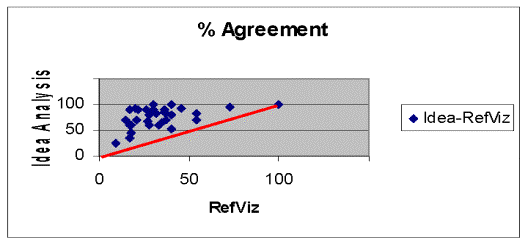 Figure 4 shows the results for the 20 randomly selected documents from the 4218 CRISP epidemiologic research projects for 2004 plus 11 additional randomly selected reports dealing with respectively, asbestos or asthma research in the same epidemiology set. The identity line represents equal percent agreement for each system. There was only one report where both systems agreed and that one involved 5 commonly used terms. The remaining random abstracts showed consistently fewer matches for RefViz than for Idea Analysis. The median percent agreement for RefViz was 28% and for Idea Analysis, 80%.