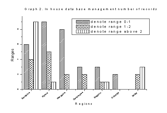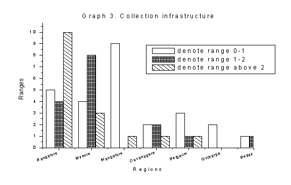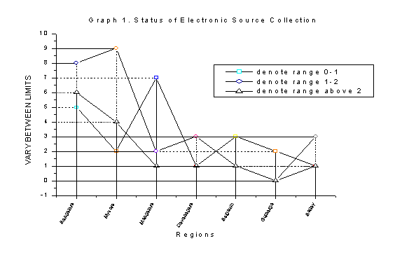 Graph 3 shows the status of electronic collections and completed in-house databases available in the sample regions. Electronic collections includes CD-ROM, e-journals, audiocassettes, and videocassettes. In-house databases includes books, journals, back volumes, theses and dissertations. Here status of the collection infrastructure is ranked into three categories: (i) low (raging between 0-1), (ii) moderate (ranging between 1-2), and (iii) high (ranging above 2).