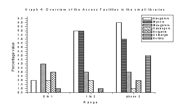 Graph 4 shows the access infrastructure available in various libraries in the sample regions. The access infrastructure is classified into two broad headings, namely (i) access points (library catalogue, OPAC, subject gateways/portals, collections of special web site addresses, and web OPAC), (ii) reading materials for the users (hard copy, soft copy, and online). To graph the access facilities available in various libraries of the sample regions, the score value obtained is converted into index value. The index value obtained is categorized into three categories: low (ranging from 0 - 1), moderate (ranging between 1 - 2) and high (ranging above 2). About 44% of the libraries have created an adequate level of access infrastructure. A region-wise analysis shows that in the Bangalore region 9 libraries have built high-level access facilities, in the Mysore region 7 libraries have established their access points to an appreciable level infrastructure, in the Mangalore region 3 libraries has built appreciable level of access infrastructure, 1 library has the high level in the Davangere region, 2 libraries have the high level in Belgaum region, and in the Bellary region 4 libraries has established adequate level of access infrastructure. From the table it is clear that, 36% of libraries are at the moderate level and 20% of libraries are at the low level of access. It can be observed from the above analysis that there is a sharp variation between the sample libraries with respect to the access infrastructure. The reason may be (i) lack of technological infrastructure, (ii) lack technical background of the library staff, and (iii) lack of regular financial funding.