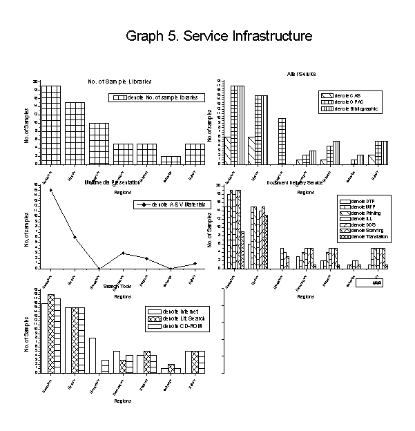 The biggest technological event of the last two decades was the invasion of digital media in an entire range of everyday activities. Libraries also have stocked digital audio/video images and multimedia documents. These digital data can be transmitted in a fast and inexpensive way through data communication networks. The digital libraries of today are network-based distributed systems, with individual servers responsible for maintaining local collections of digital documents. Electronic libraries help to expand access, increase usability and effectiveness, and establish new ways for the individuals to interact with information. In this context, the above graph 5 explains the status of the service infrastructure developed by the sample libraries in the sample regions.