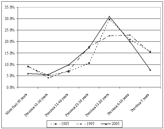 Table 7 shows which publishers are represented most frequently among the publishers of monographs used as secondary sources. The citations in the 1985 articles generally did not include publisher information, so data for that year is not available. In both 1995 and 2005, university presses are clearly the predominant source for this type of monograph. It seems likely that any kind of crisis that affects the future of university presses may well have a negative impact on the continuing production of scholarly monographs in this field.