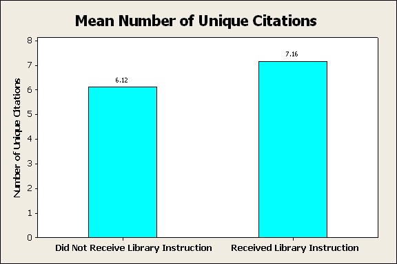 The first piece of data analysis examines the difference in mean numbers of unique citations among the two groups, those exposed to library instruction and those not exposed. The emphasis is on unique citations as many of the students confuse the purpose of a bibliography with endnotes, so that the same source such as a website or a textbook may be cited multiple times. Figure 1 and Table 1 demonstrate the differences in mean numbers of citations between the two groups. While the group receiving library instruction did have a slightly higher mean number of citations (7.16 vs. 6.12), the difference only tends towards statistical significance with a P value of .070. Thus we cannot attribute the increased number of citations to the affect of the instruction session.