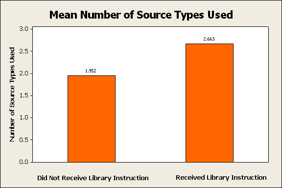 Looking beyond the mean number of overall citations, we next examined the types of sources each group cited. Here we start to see some more significant differences (Figure 2 & Table 2). The students that had received the instruction session cited on average 2.66 different types of resources (out of 5 possible types; journal articles, Internet sites, library databases, books or other), compared to the average of 1.95 types of resources cited by those not receiving the instruction. This difference was statistically significant. This indicates that the library instruction session demonstrated to the students that other sources of information were available and easily accessible. Once they were made aware of this, the students were more likely to take advantage of the various resources at their disposal, thus bearing out Hypothesis 1.