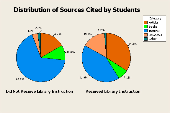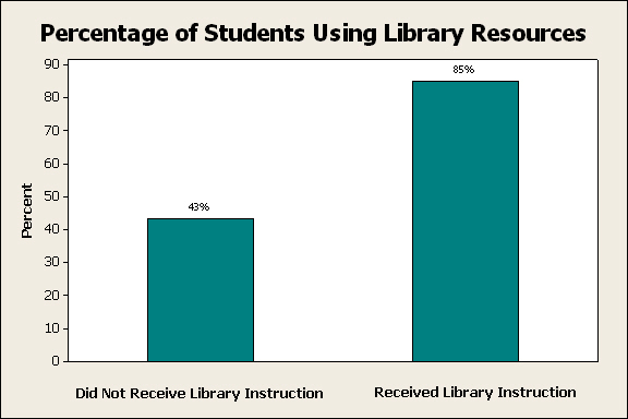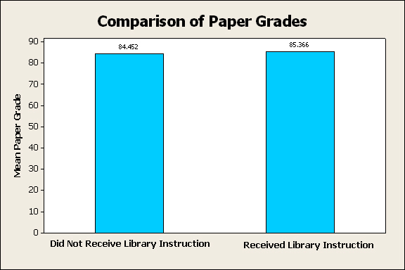 The data were analyzed with Minitab (Version 14). Tests of differences, means, and proportions were conducted to determine if the differences in the types and numbers of resources used by the two groups of students or the grades they received were statistically significant. The data entered for each bibliography included the total number of unique citations and the number of citations for journal articles, books, library databases, Internet sites, and other. Those that were coded as “other” were primarily personal interviews that the students had done to gather research. Also included were the course grade, the paper grade, and the identifier for whether they had been exposed to the library instruction session or not.