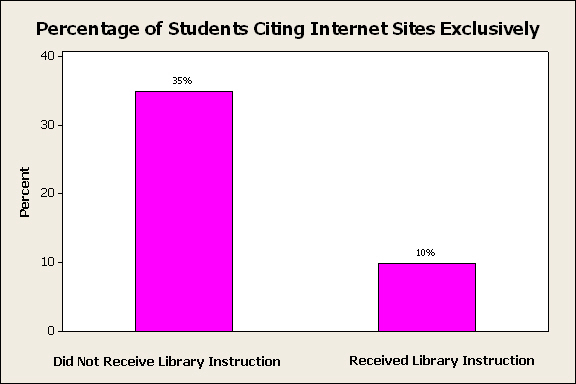 Overall, the results of this study provide empirical evidence of the effectiveness of librarian-led instruction sessions, particularly when they are tied to specific assignments. Statistically significant differences were found both in types and numbers of resources used by students in the two groups. Students not exposed to the instruction session also relied much more heavily on Internet sources, with over one-third citing nothing but Internet sites in their term paper bibliographies. However, the idea that using more library resources would automatically improve a student’s grade on either the term paper or in the course as whole was not borne out. Term paper and course grades were virtually identical for each group.